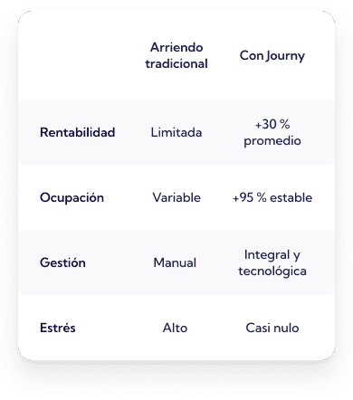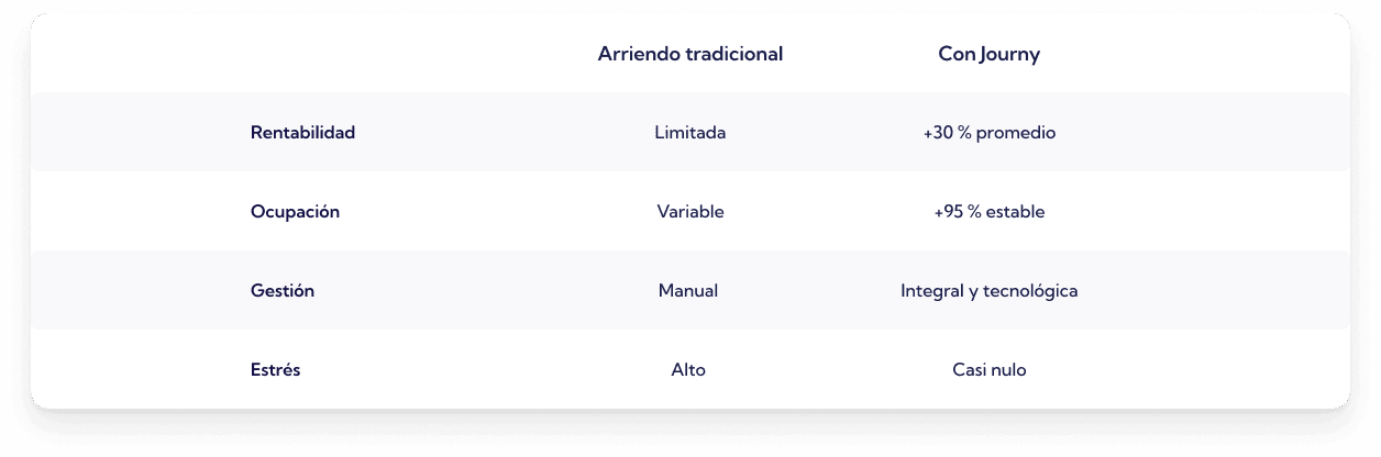 +30 % promedio vs arriendo tradicional, con mayor estabilidad.